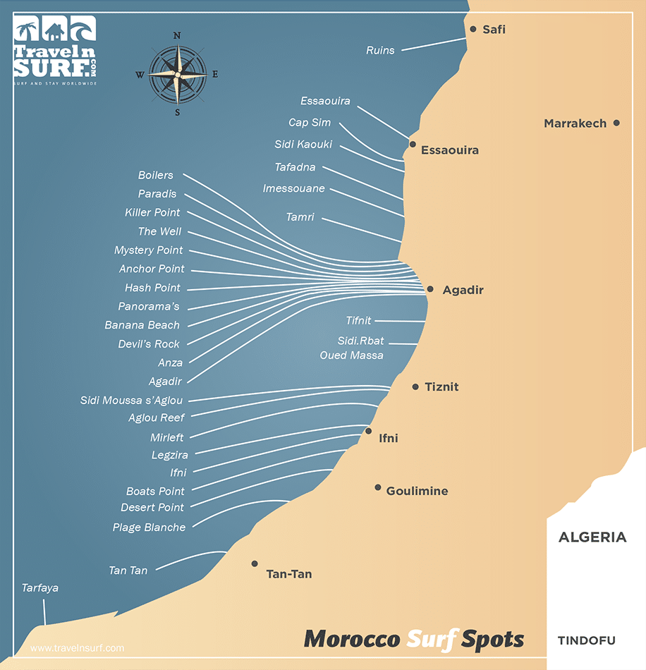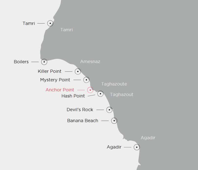 Les spots les plus connus aux alentours de Taghazout : Anchor point, Mysteries, La Source, Killer point, Banana, Devil’s Rock… Mais n’hésitez pas aller à Imsouane pour l’un des plus long ride de votre vie car c’est la plus longue vague du Maroc