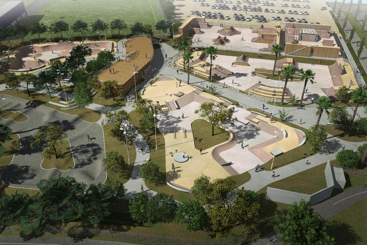 Le complexe sportif prévoit un skatepark de 1512 m2, bowl de 1027 m2 compétitions internationales, streetpark de 1096 m2 compétitions internationales, espace dirt de 1056 m2, tricks learning de 813 m2 et BMX Park de 1607 m2 compétitions internationales. Un bâtiment de 308 m2 avec des espaces d’accueil, une grande terrasse sur le toit, vestiaires et ateliers. La surface totale de glisse est estimée à 9000 m2, des gradins, des tables de pique-nique.”